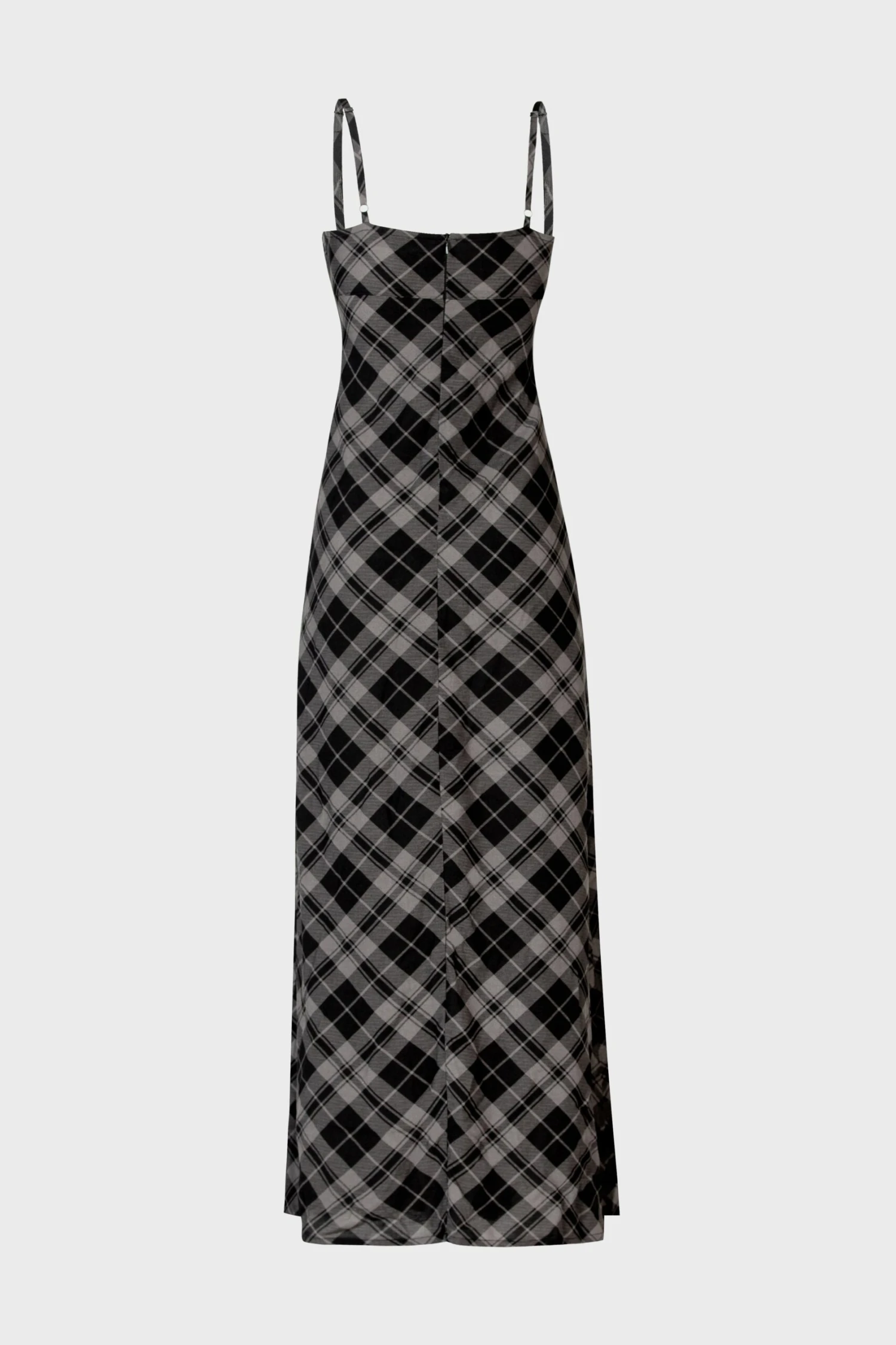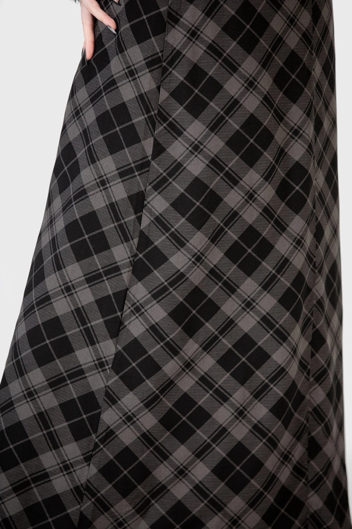 – Statement grey tartan print.