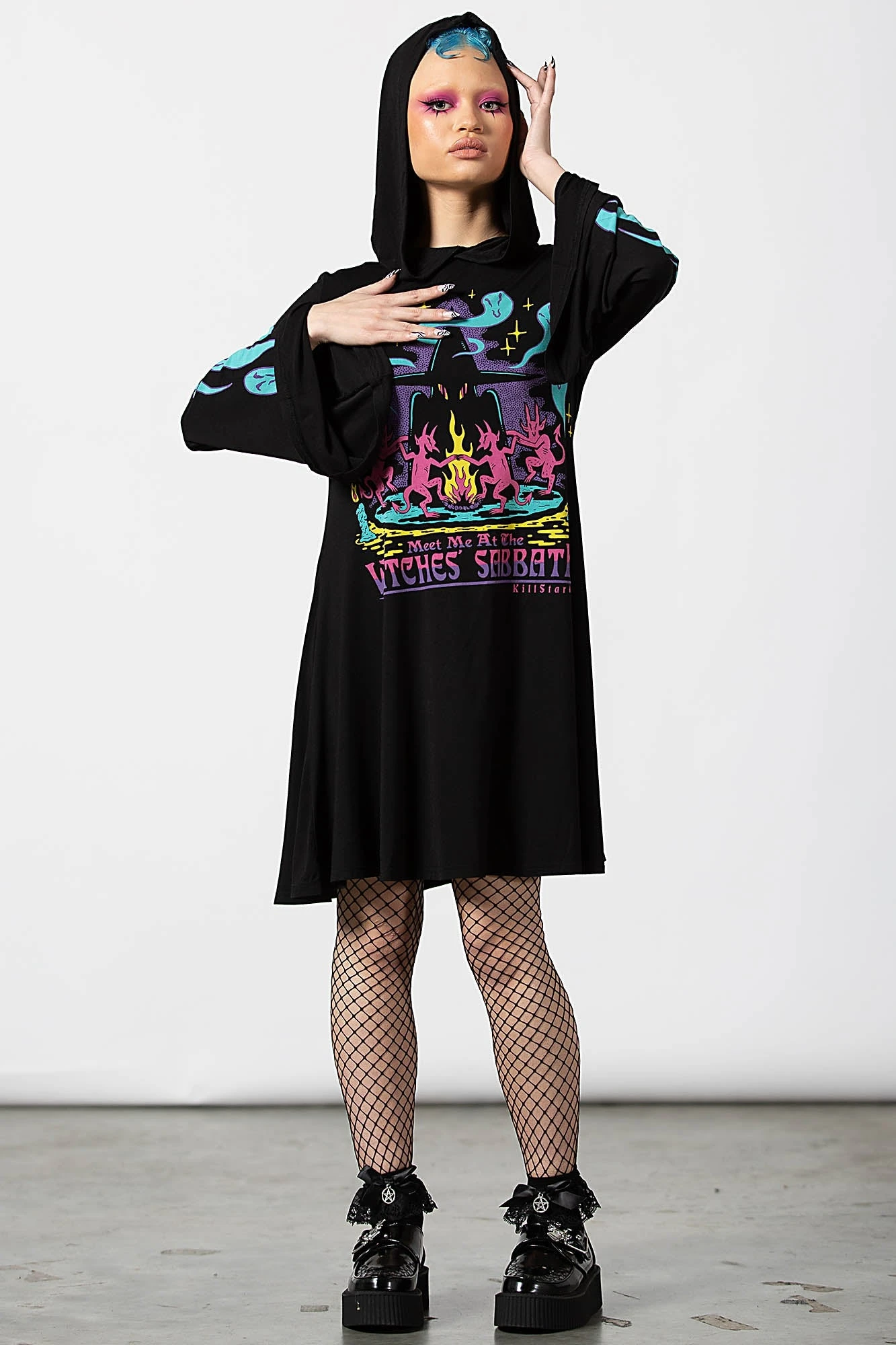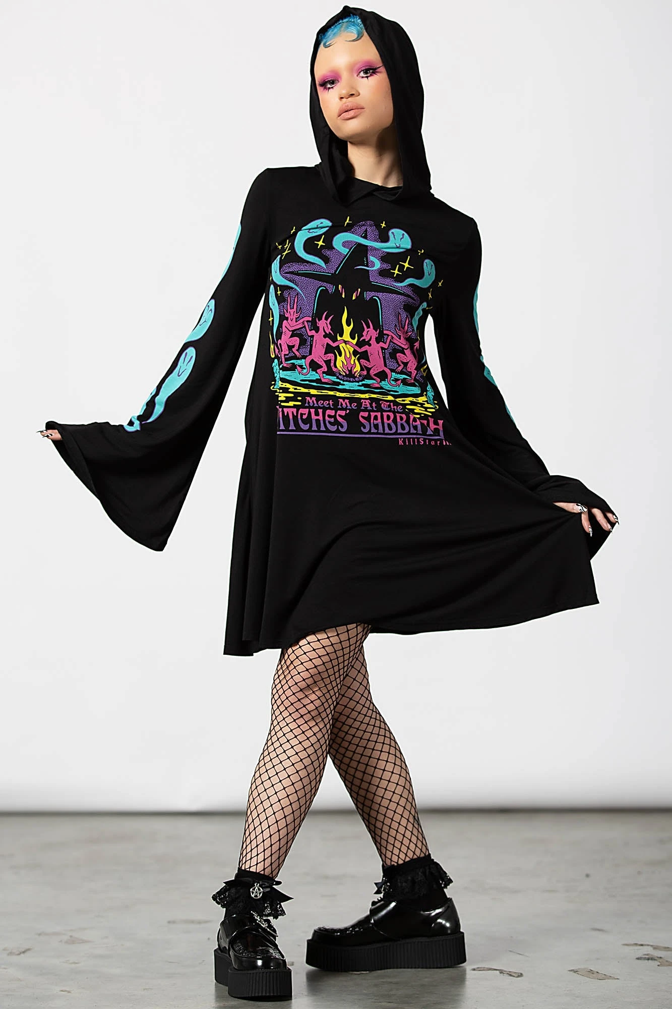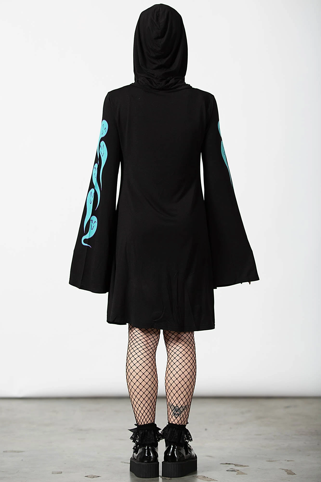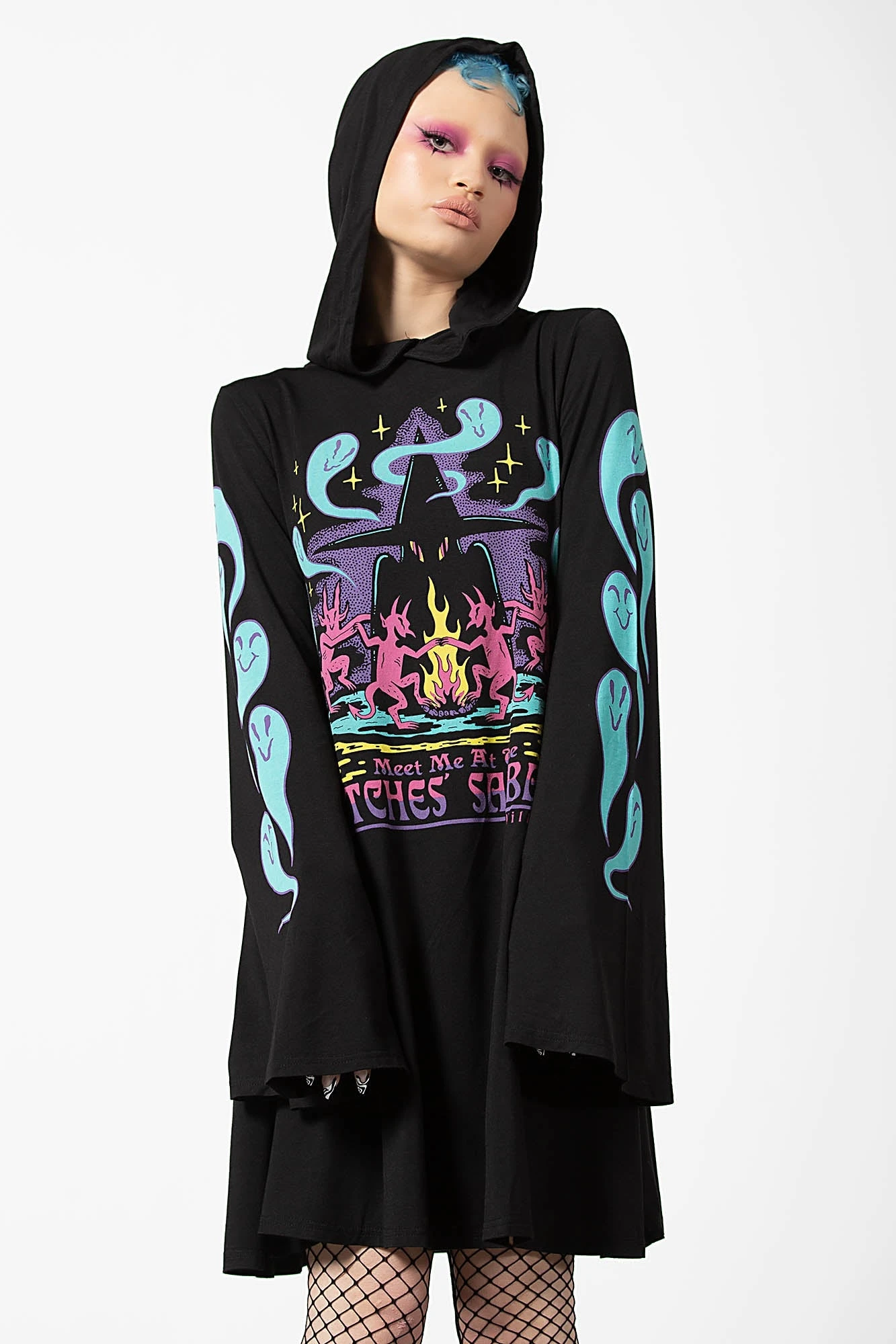 Lurk in the shadows in our โDark ladyโ hooded dress. Crafted in soft, stretch jersey fabric to give a killer fit. Finished with an XL hood, bell sleeves and large statement graphic on the front and down the sleeves this dress is perfectly practical but still has plenty of attitude.