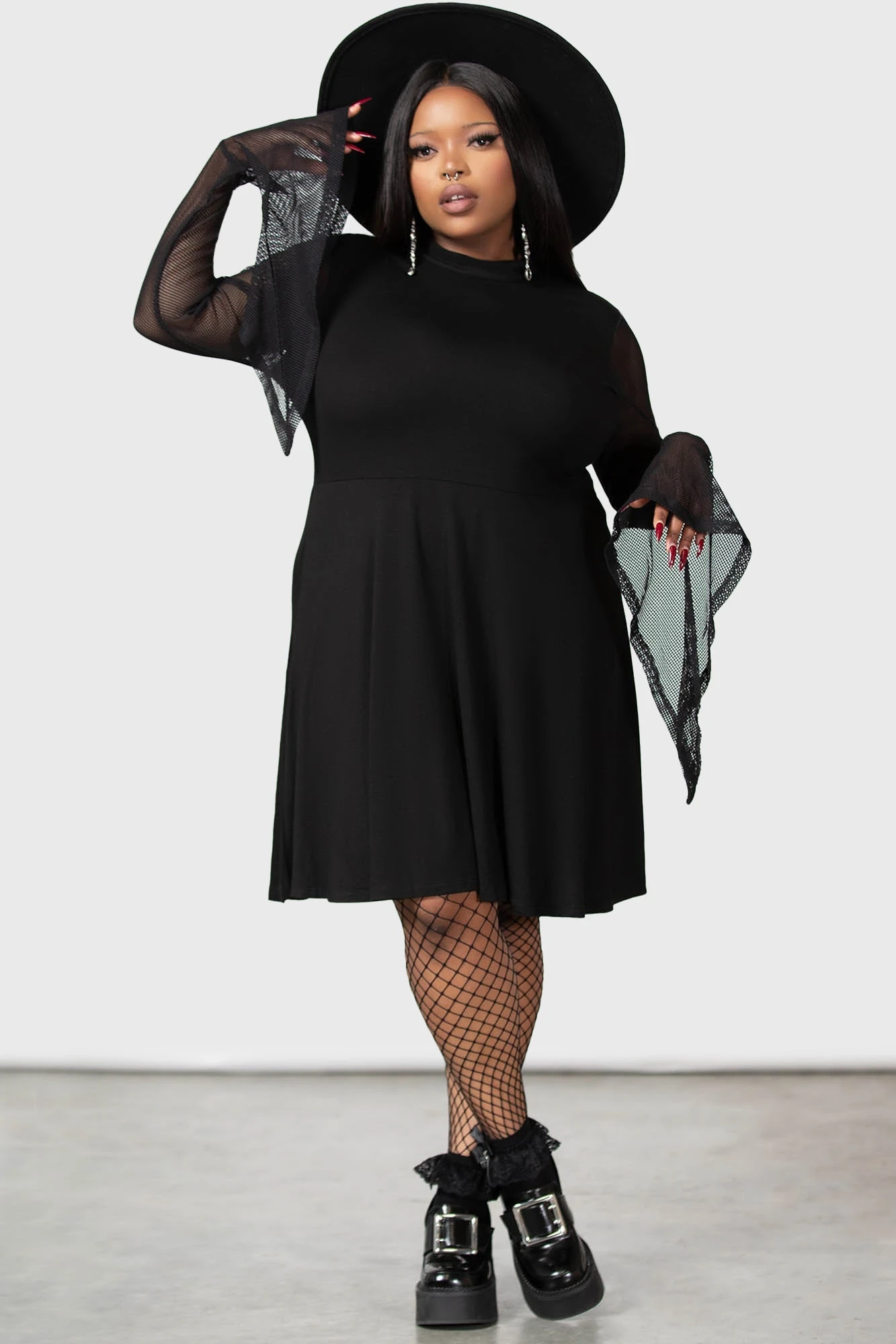 – Statement, long fishnet bell sleeves.